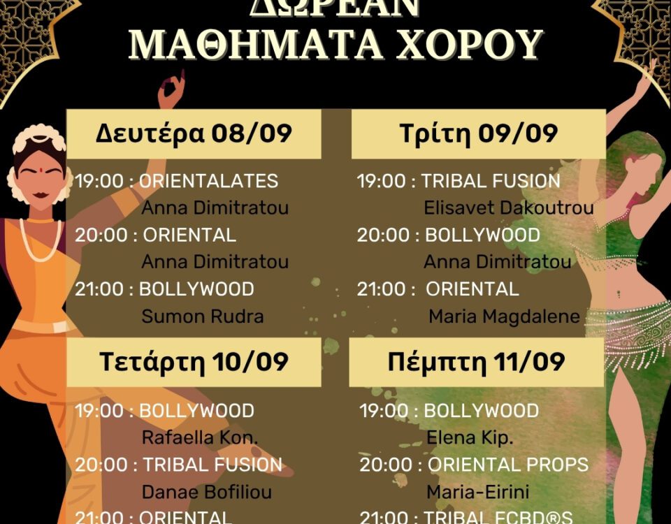 ΔΩΡΕΑΝ Μαθήματα Χορού – FREE DANCE CLASSES Τετάρτη 14 Σεπτεμβρίου / Wednesday 14 September 18:00 – 19:00 Bollywood Kids (6 – 11 years old) with Anna […]