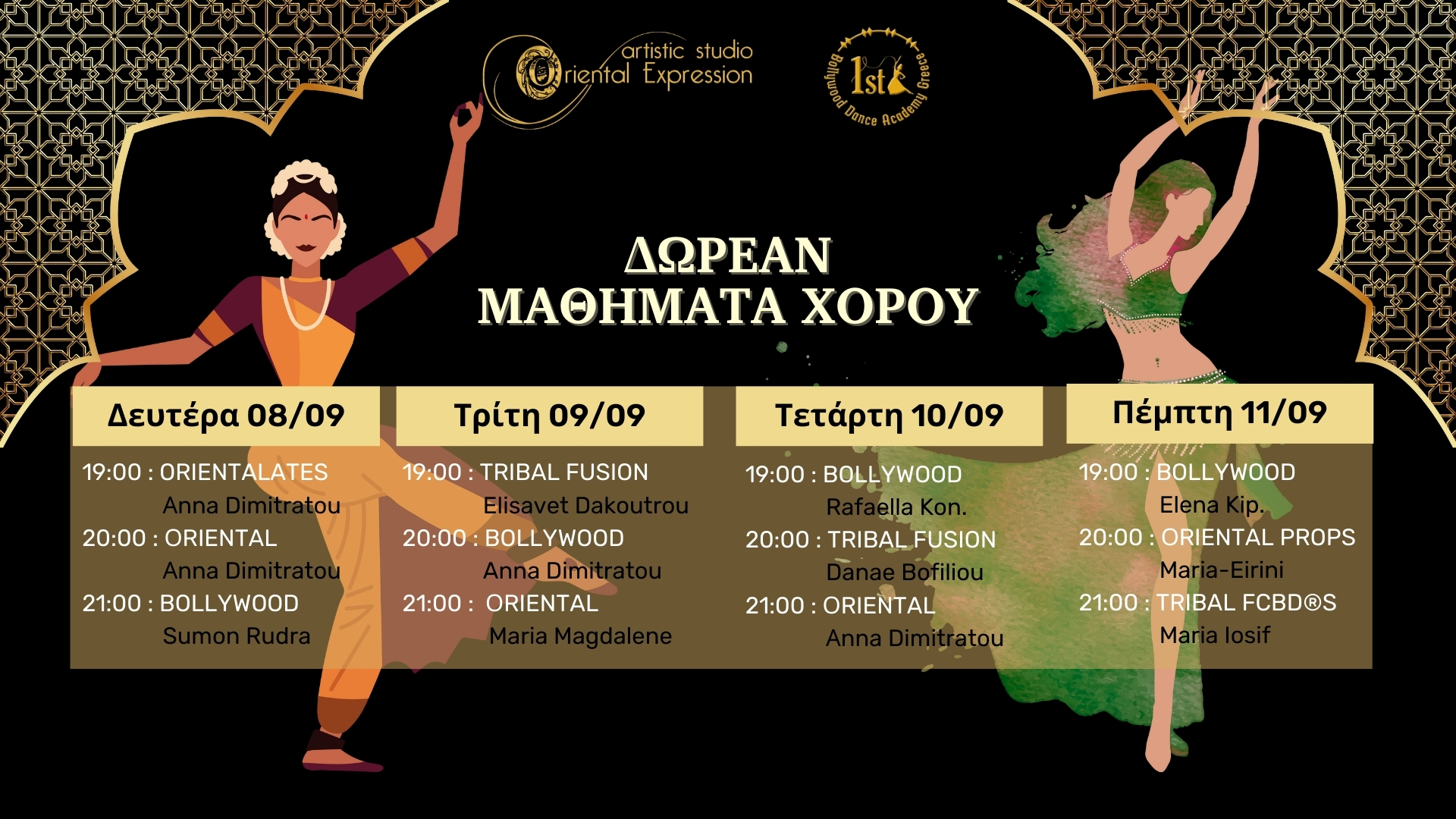 Ανακαλύψτε μια ποικιλία από στυλ χορού, όπως Oriental, Bollywood, Tribal Fusion και ελάτε να γνωρίσετε την ομορφιά των Ινδικών και Ανατολίτικων χορών με τους δασκάλους του Artistic Studio ORIENTAL EXPRESSION και της 1st Bollywood Dance Academy Greece.